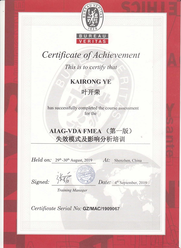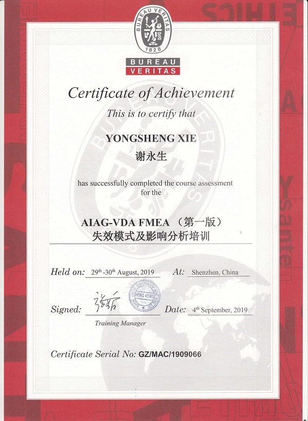 緊跟體系要求,公司在新版FMEA2019正式出版發(fā)行后及時安排工程、品質(zhì)同事參加行業(yè)內(nèi)著名培訓公司的培訓,祝賀兩位同事順利結(jié)業(yè)。